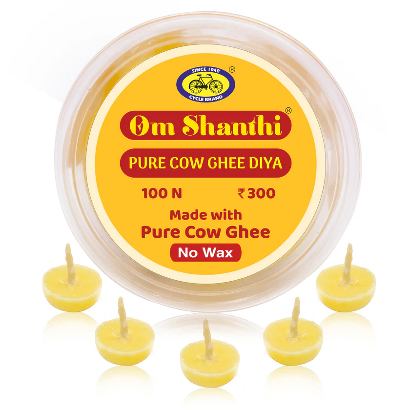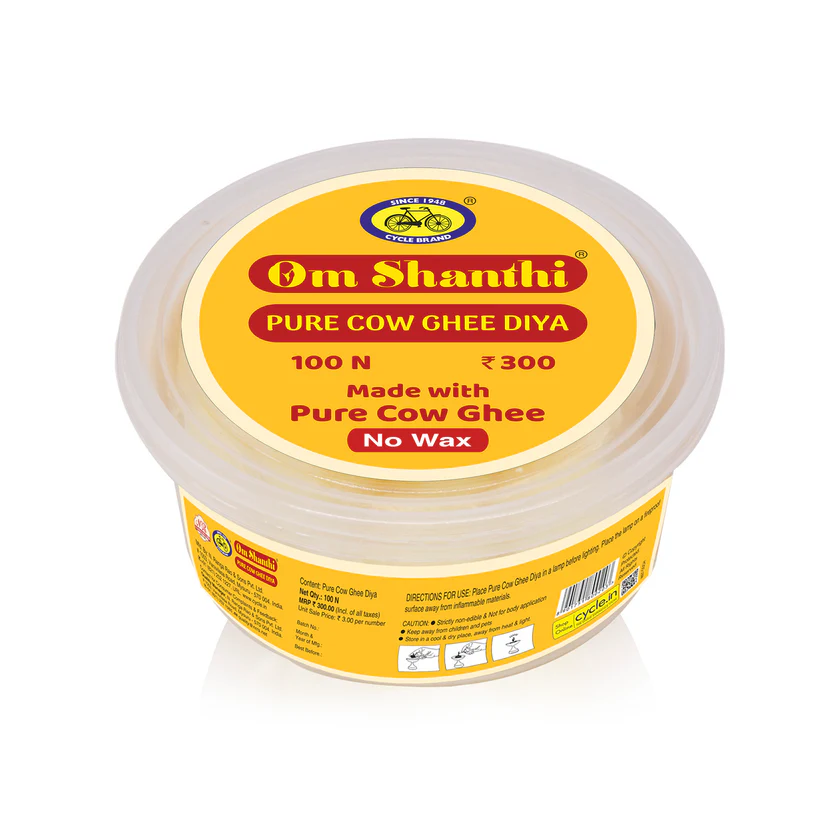 Om Shanthi Pure Cow Ghee Diya made from Cow ghee are convenient and apt replacement for traditional ghee lamps. These Pure Cow Ghee battis have a burning time of 20-30 minutes. Place these Diya Bhattis in a lamp and light them.
